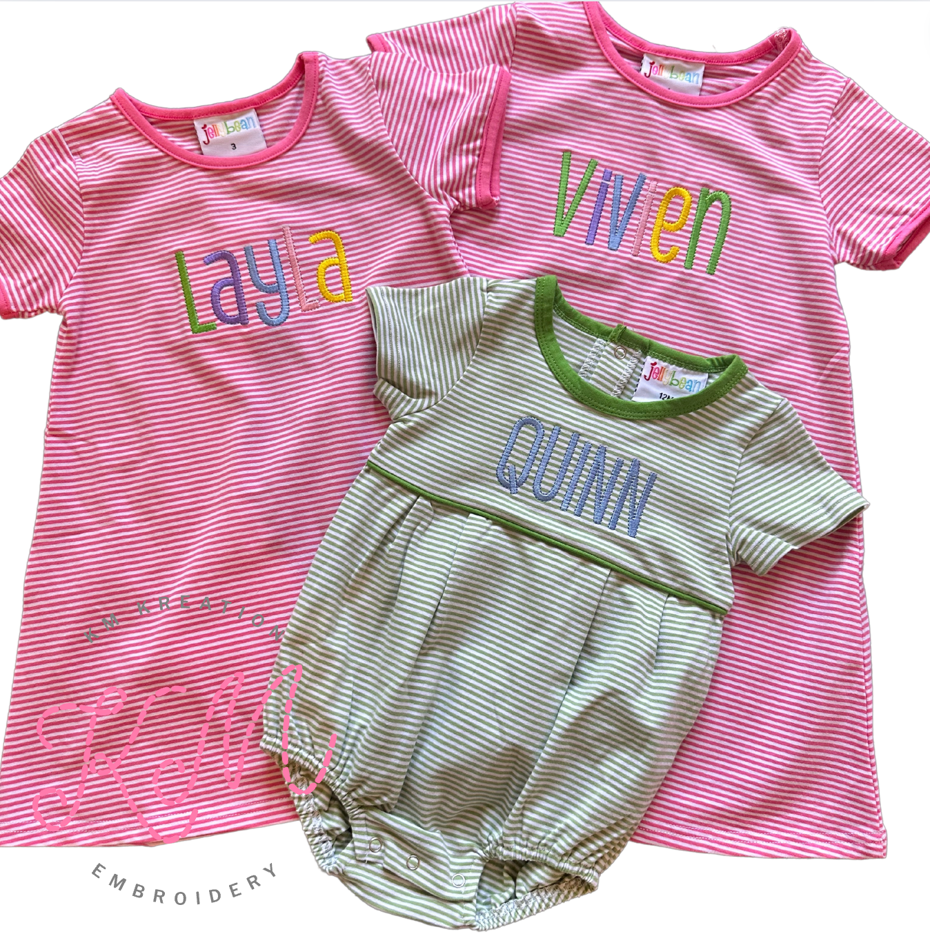 Welcome to KM Kreation Embroidery! My name is Kelly and I am so honored you are here! I am a Speech-Language Pathologist by degree, but taking a few years off to spend time with my children while they are young. My husband and I live in Fayetteville, Arkansas with our 2 boys. I started monogramming items for friends and family in 2014 and it has just continued to grow every year. I am so thankful for all of you for allowing me to dress your children and play a small role in your celebrations and life moments! Please do not hesitate to email or DM me if you have any questions or have any specific requests! This website is meant to streamline invoicing and shipping procedures, but not to decrease my interaction and communication with all of you!