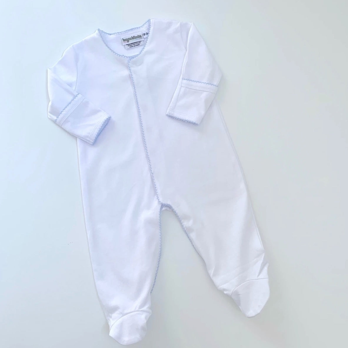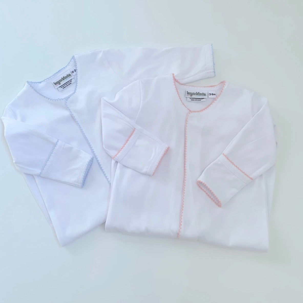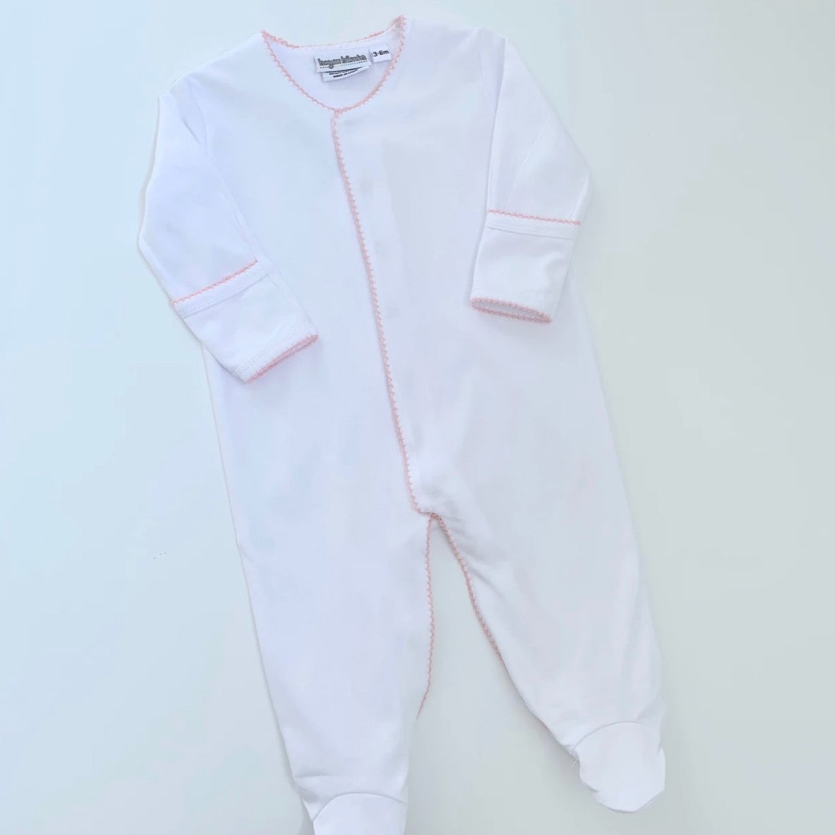 Our picot footies have been redesigned for a better fit and a sweeter look. They are made of soft organic cotton, have fold over cuffs, and have hidden snaps.